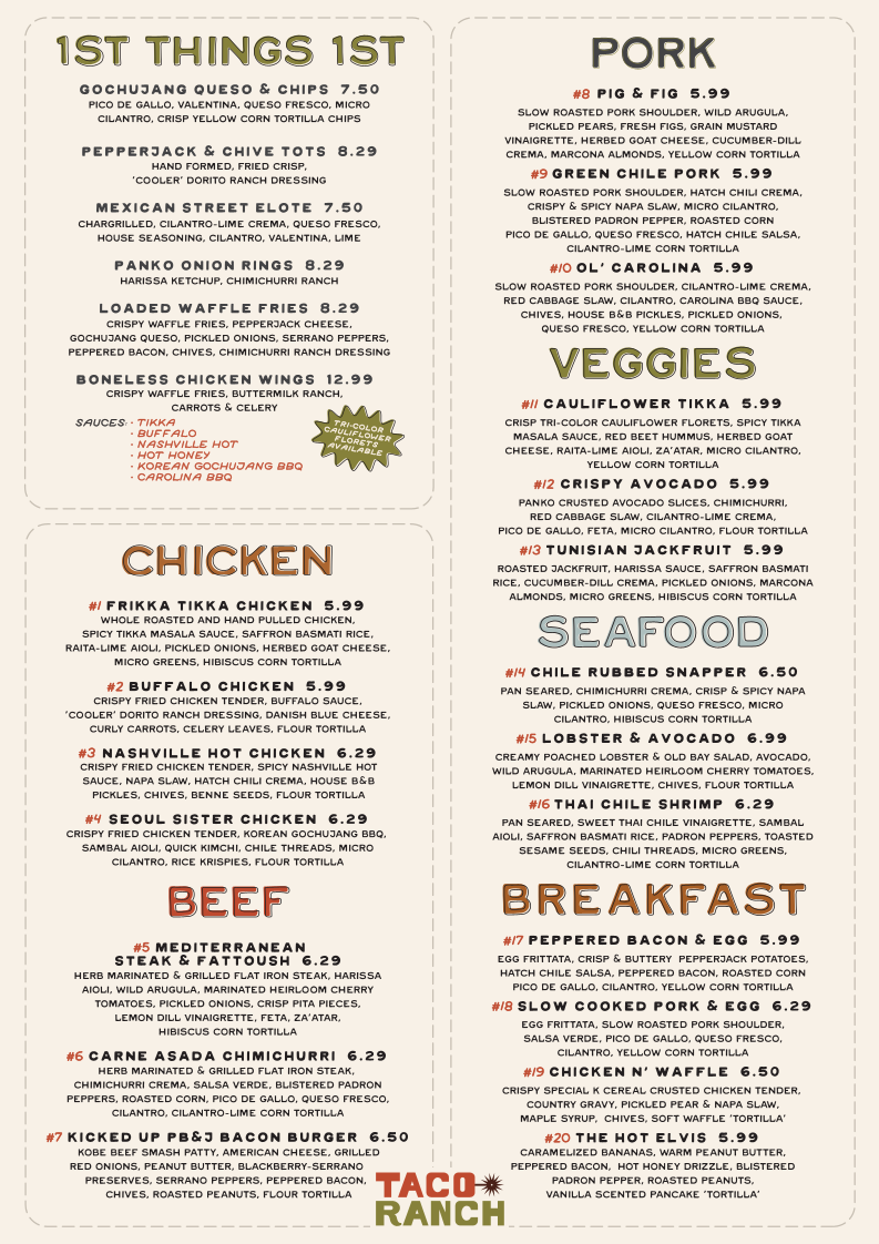 Introducing Taco Ranch, an exciting culinary destination located at 2726 Parkway Suite 4, Pigeon Forge, TN. This vibrant eatery elevates traditional taco offerings with a twist, showcasing innovative flavors and the freshest ingredients. From the Nashville Hot Chicken Taco to the Seoul Sister Chicken Taco, each dish is crafted with precision and care, promising a memorable dining experience.